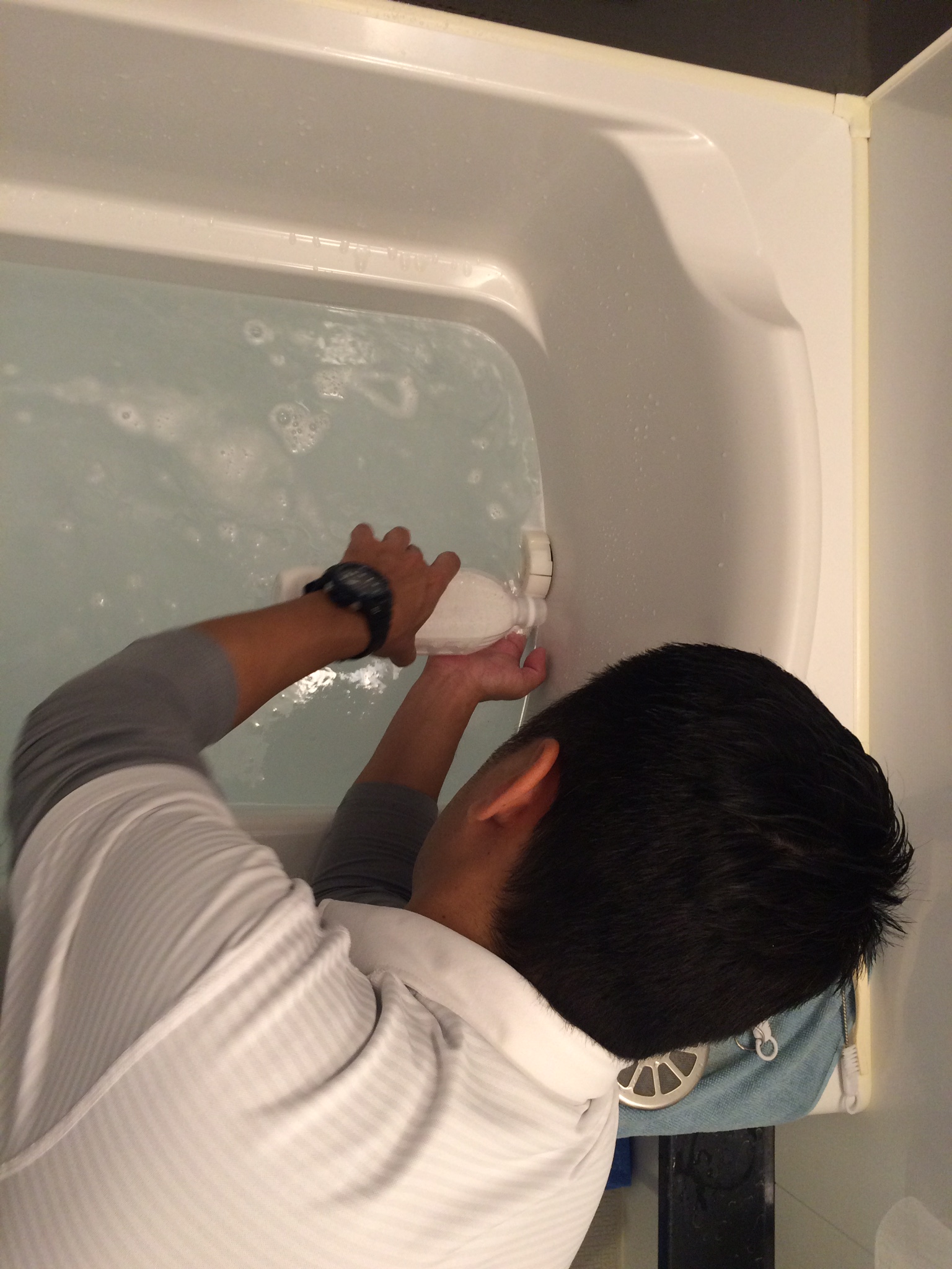 洗剤を配管に挿入します。実はココでノウハウが必要なんです。給湯機の性能を理解していないと洗剤を配管に挿入できません。