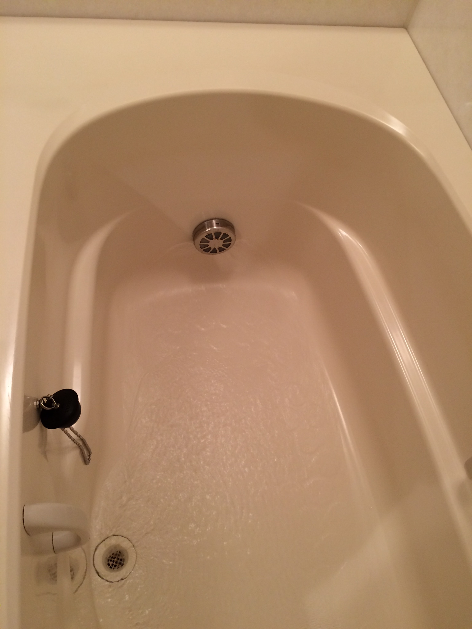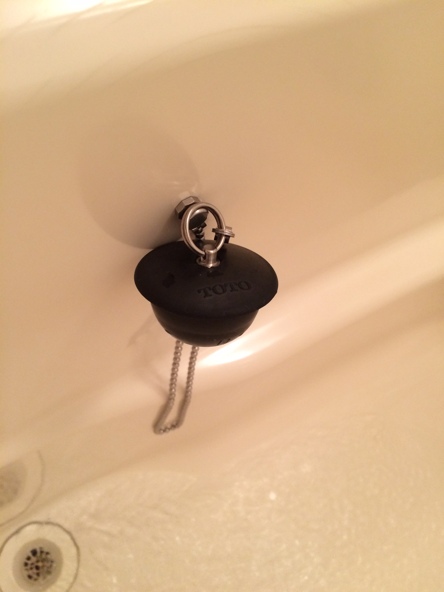 いつものように風呂釜配管洗浄して、バスタブを磨き上げてお引き渡しをするのですが、チェーンでついているお風呂の栓の場所に困っています。